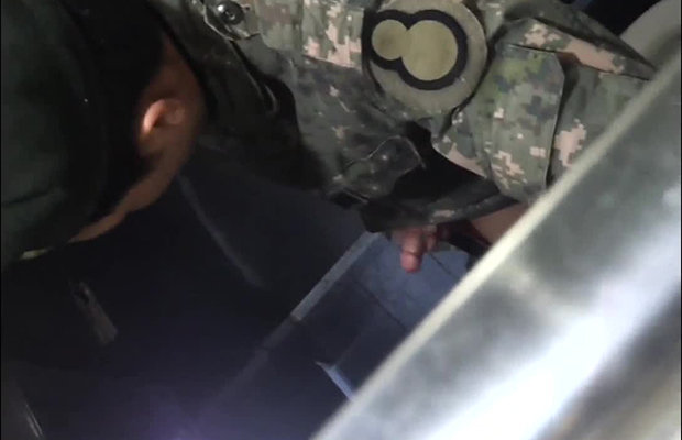 After wanking his dick off, the soldier cleaned his penis with some toilet paper: nice shot for a quick shuffle!
