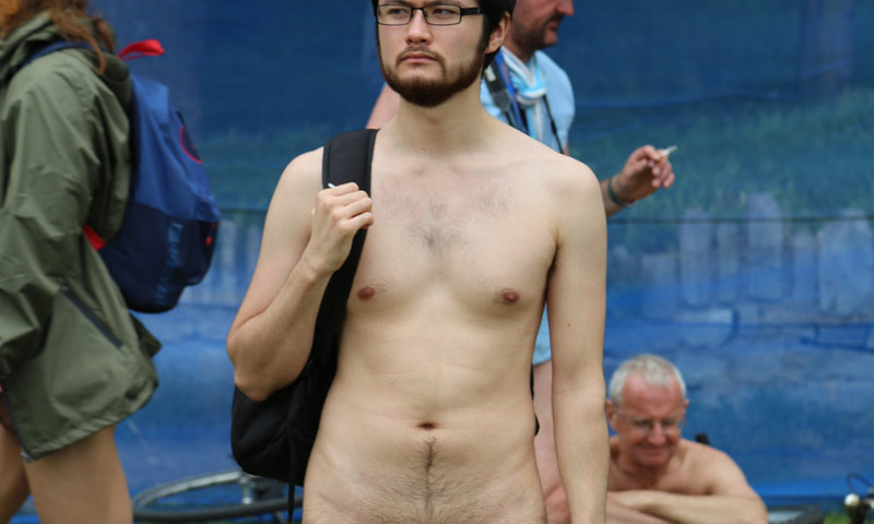 Here you some more shots from the London World Naked Bike Ride: this nerd guy gives us an amazing full frontal view, showing his uncut dick in public.