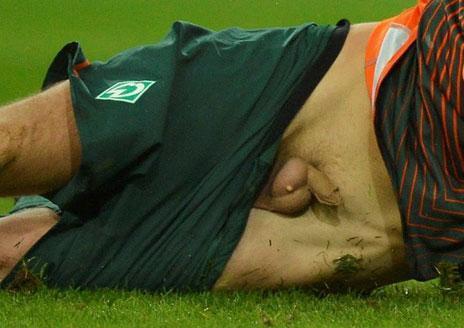 Aaron Hunt is a German football player and you can now see his uncut dick popping out of his shorts during a match. He slipped on the pitch and his pants dropped due to the friction with grass. His cock accidentally popped out and everyone could see it! Furthermore, now we all know that Aaron Hunt shaves his dick and nuts too: nothing new for a German dude!