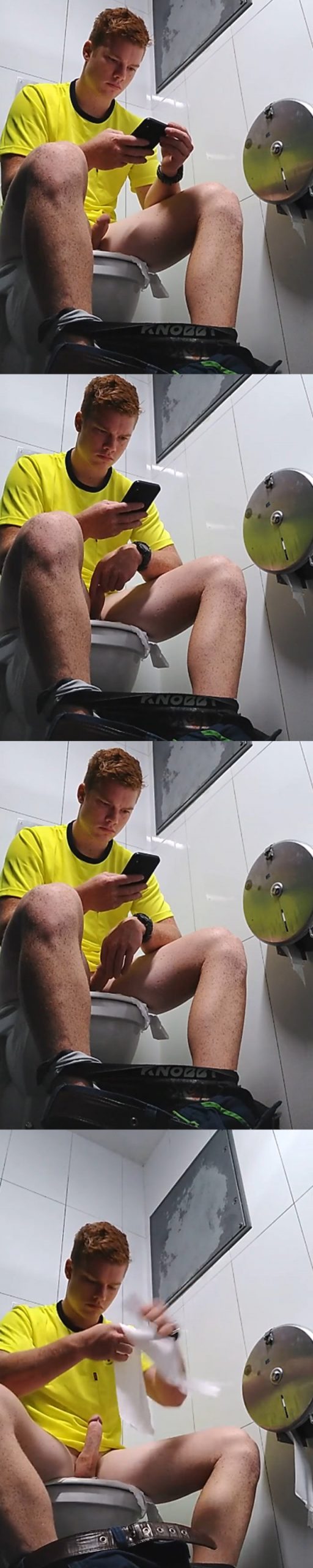 Generally when a guy shut himself in a public toilet to jerk off he brings the work to the end. Just to mention some guys caught wanking in public toilets, the long haired horny dude caught jerking is one of my favourite. What about the totally naked boy caught jerking in the restroom? But this time the guy does not complete the mission. Actually I find this really exciting: this guy has been secretly caught in a public toilet, at first sight he seems to need pooping, but once he starts watching his mobile phone something happens.
