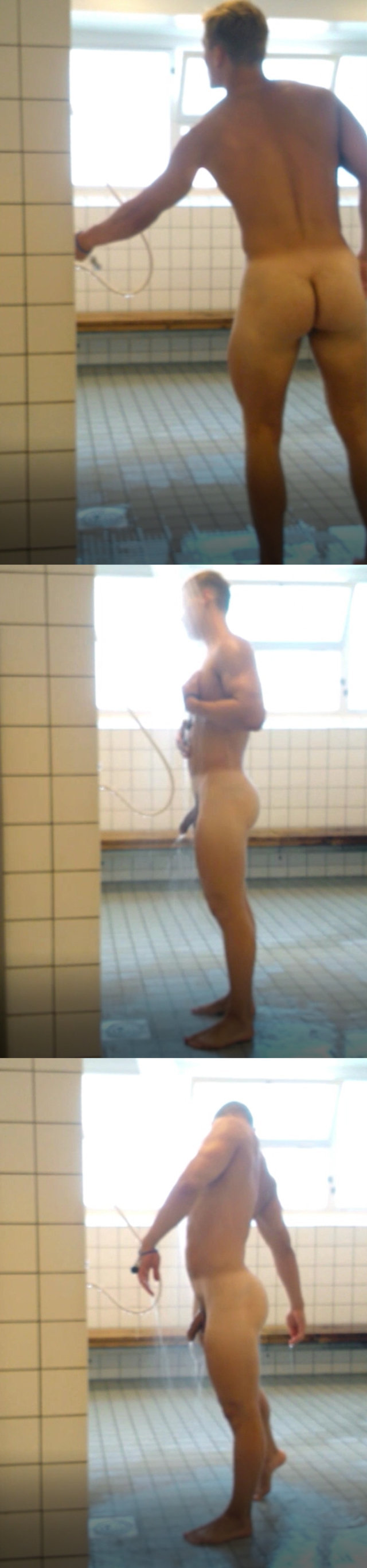 The perfect gym buddy to find naked in the open showers: spy on him and watch him washing his sexy body