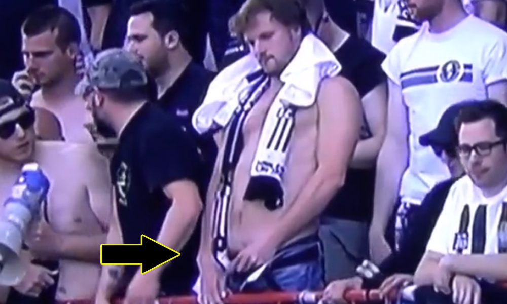 Not only a cascade of “boos” rain down from the stands, even golden showers today! Yes, correct! Watch this brave supporter caught while peeing from the stands in the crowd! He’s drunk for sure, but it’s absolutely exciting watching him revealing his meaty uncut cock and taking a pee in public!