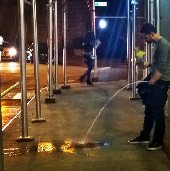 I told you before that drunk guys going out at night are much more inclined to piss in public. This guys looks really handsome: he takes a pee in the street, but he doesn’t know that he has been busted by a camera.
