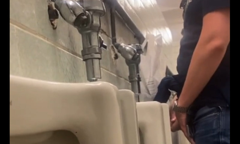 Spycam video featuring a hot dude with nice big dick caught taking a pee at urinals