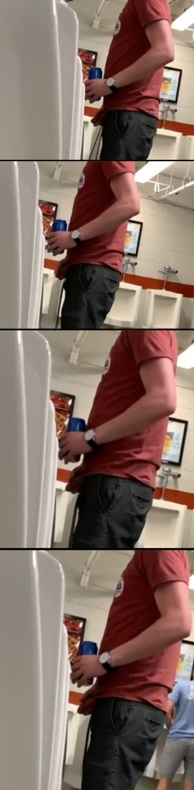 Another hung guy has been secretly captured on video while taking a pee in a service area restroom. Watch him unzipping his pants and pulling out his big cut cock (and nuts). See more candid action at EricDeman now!