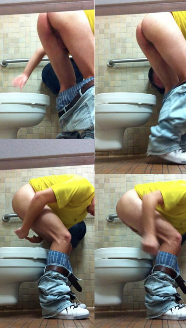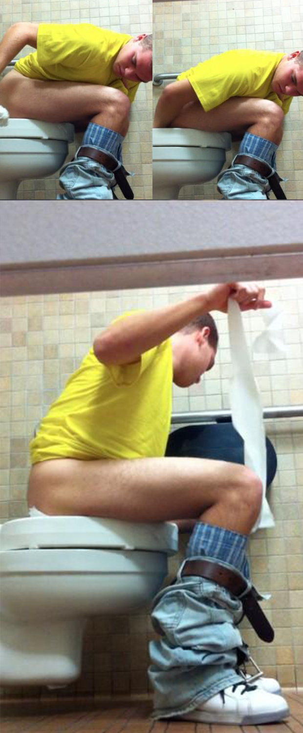 This is a really intimate situation: a young guy has been caught inside a public male bathroom, he was taking a rest on the bowl.