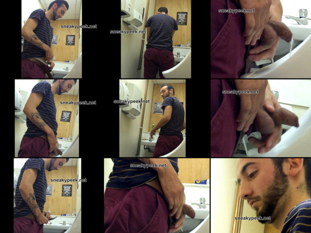 It’s horny when a lad doesn’t go through the hassle of pulling his dick through his fly but instead pulls out the whole package to take a piss. The Sneaky Peek voyeur captured on his hidden camera a good look at this tattooed fella’s full hairy balls alongside his long silky foreskin while he’s at the urinal. The guy keeps showing his nice uncut hairy cock. Enjoy the preview stills and spy on this guy caught by spycam while taking a pee in a public restroom.