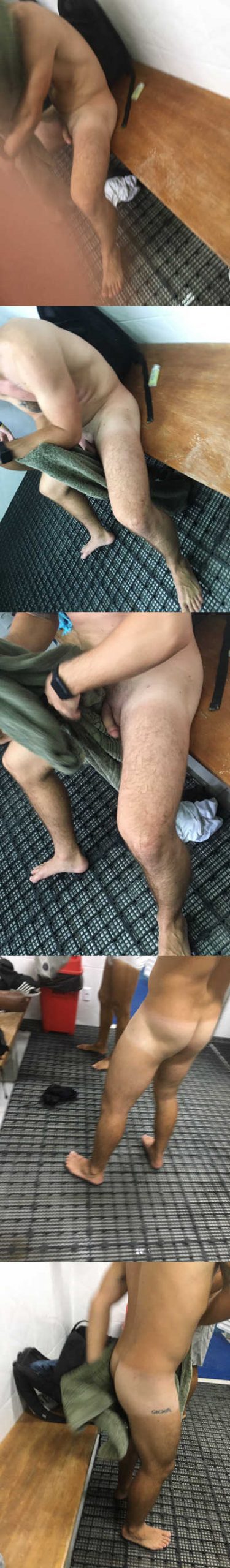 This hot lad has been caught off guard by his team mate. This guy is drying off his body with the towel after shower: he’s sitting on the bench and the team mate is next to him. With a quick move he took some amazing candid shots to show us how hung is his friend. But he not only wanna show us his big dick, but he waits for him to stand up to catch him from behind too and give us an awesome rear view! Nice work!