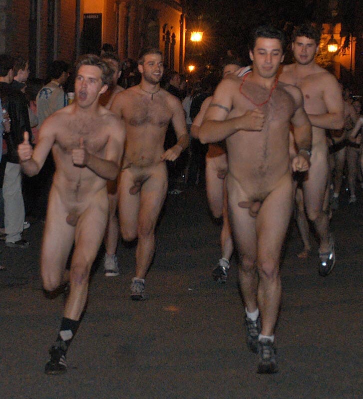 These sexy guys are running naked, with their dicks bouncing… but the other people don’t seem to be shocked by that!