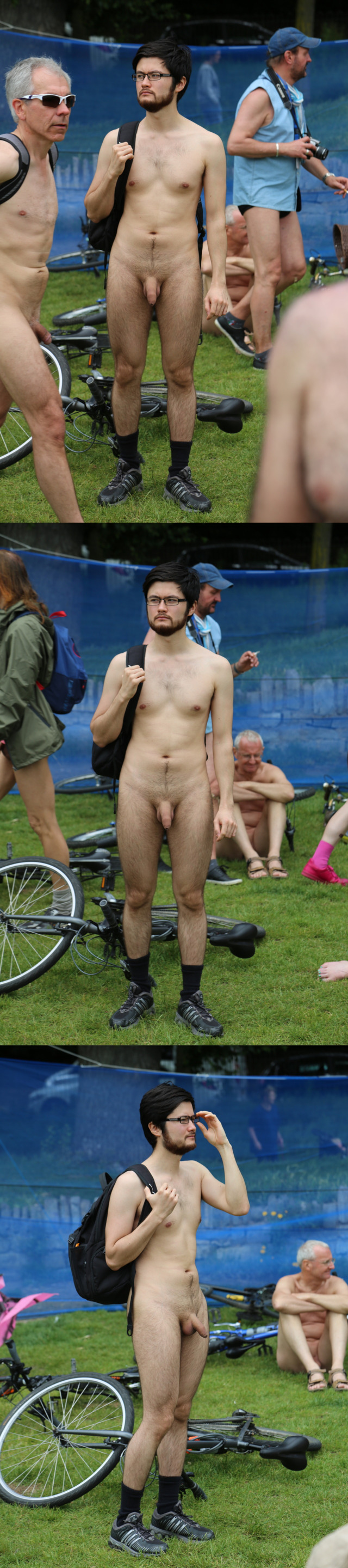 Here you some more shots from the London World Naked Bike Ride: this nerd guy gives us an amazing full frontal view, showing his uncut dick in public.