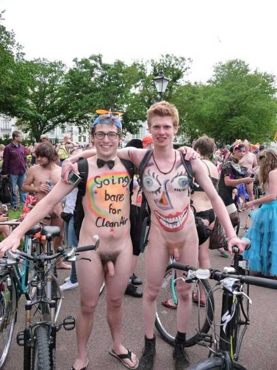 Here are two smiling friends having fun with their dicks out at WNBR, the world’s hottest bike ride. The nerdy guy has an uncut dick and the other ginger dude is cut: but they both have one thing in common that pleases me, as it surely does many of you. Both of these guys don’t shave their dicks: their bushy dicks are adorable! Check out how happy these two guys are to be naked in public.
