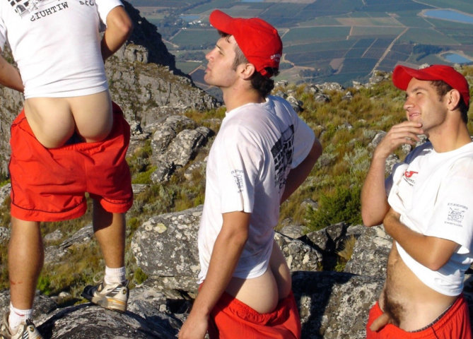 The second shot is much more clear, these three guys are not drunk (finally!) and they just wanna pose semi-naked showing two bubble asses and a wonderful thich hairy dick! What do you think about?