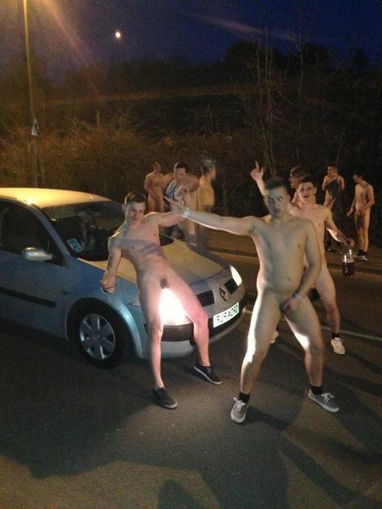If you love to see naked guys in public these two shots are for you: in the first picture you can see a group of drunk straight friends completely naked in the street. I think they are celebrating something!