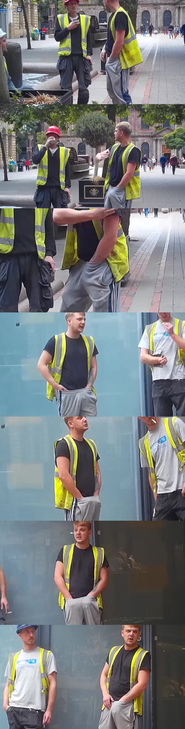 Let’s spy on these construction workers secretly filmed during a break in the street. Watch them self grabbing their bulges, even with hands down in their panties. They remind me that handsome dude caught self grabbing in a betting shop! Anyway, they don’t care about the people in the surround. Real machos act this way, lol!