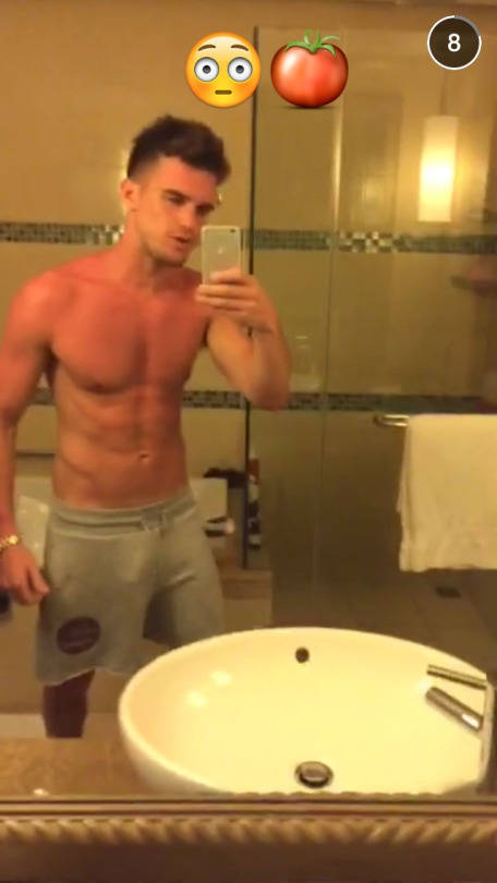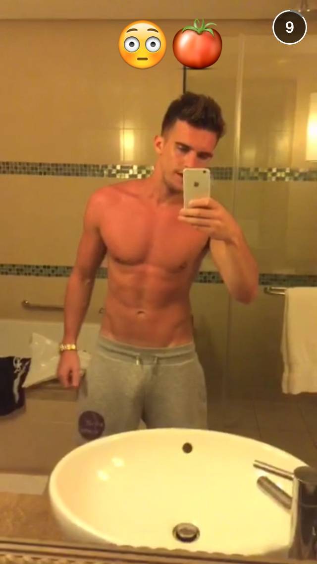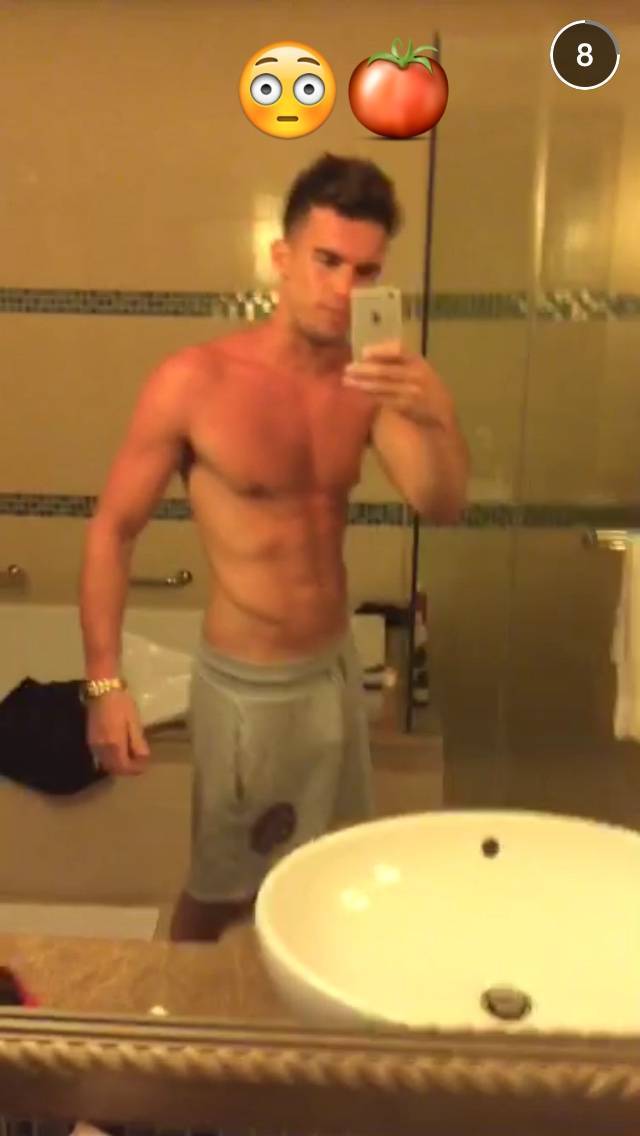 Gaz is looking for more visibility and after showing his nuts on tv during the Geordie Shore, he sent out some shirtless selfies on Snapchat: if you look carefully at the following pics, you’ll notice his big dick bulging in his trousers. He’s very proud of his huge cock and he goes on taking selfies in the mirror.