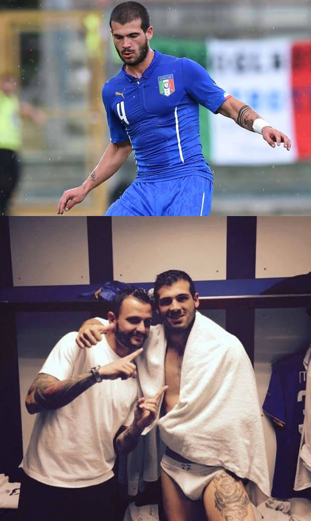 Let’s celebrate in the footballer lockerroom! Stefano Sturaro is a sexy italian soccer player and he has been caught semi naked, with just a towel on his shoulders and wearing a very revealing underwear. Enjoy his big dick bulge!