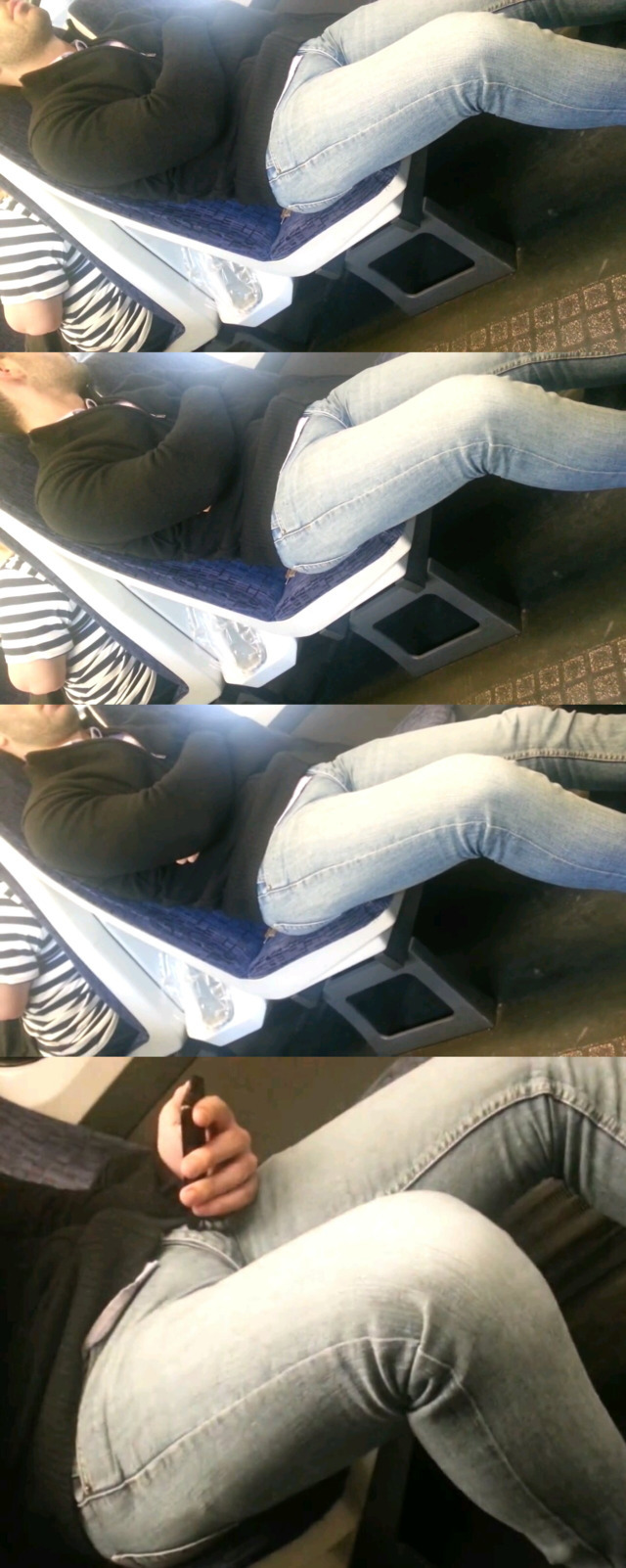 This stud has been caught while sitting on the bus, but there’s an impressive bulge in his trousers.