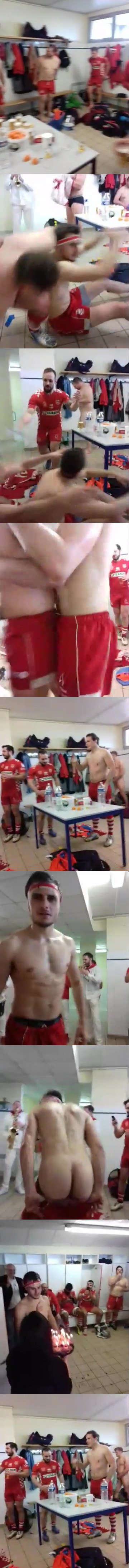 Hey guys, let’s have fun with this rugby team celebrating a mate’s birthday in the locker room after game. They took an interesting video with an iPhone while the sportsmen party in the changing room. Let’s see these rugby dudes going wild and flashing both their dicks and butts to the camera. EricDeman got the original video, here are some preview stills, enjoy!