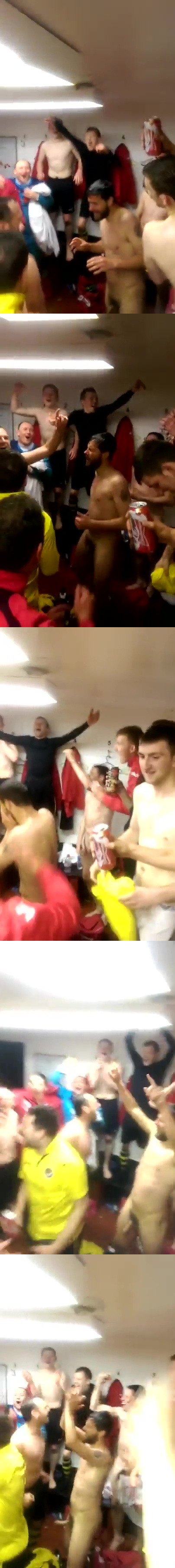 These footballers are so excited about their victory after a game that they do not care about the mates taking videos in the locker room with the mobile phones. Focus on the bearded soccer player in the middle of the locker room: he jumps totally naked, letting us see his huge uncut dick bouncing like never before! He’s hairy too! Amazing! The full video is absolutely hot: you can watch it here.