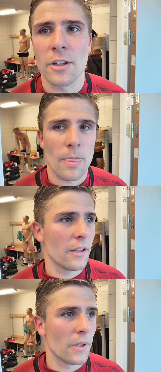 Sometimes footballers don’t care about cameras inside the changing room, and this is the result: a hot blond stud has been captured completely naked during an interview. He feels so comfortable that he keeps touching and grabbing his dick while undressing!