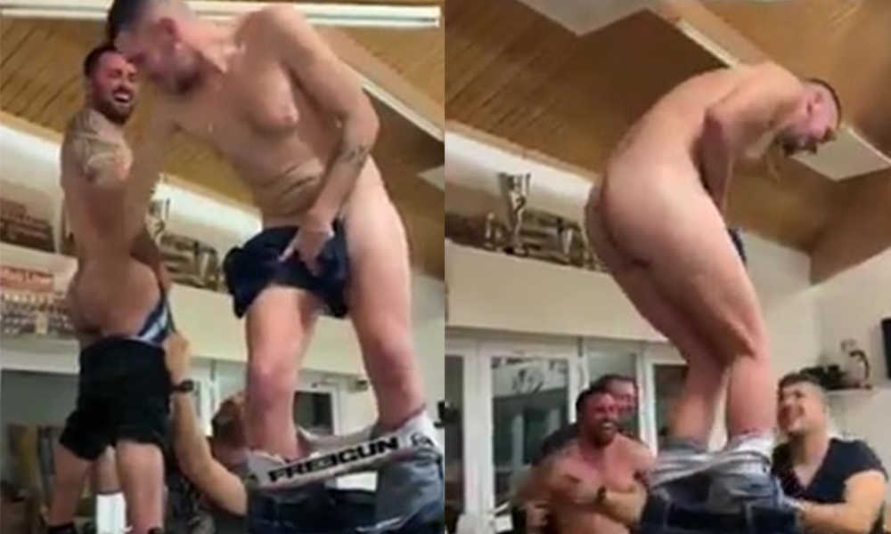 If you regularly follow the blog of Spycamfromguys, you just have to hear “rugby guys” or “rugby lads” and immediately a light bulb goes on: you already know what you’re going to see, or rather, you immediately understand that you’re going to see some rugby players that after a few beers do shit and in all likelihood pull out their dicks or show their asses. This is a little bit the summary of the situation, it is what everyone thinks and actually it is the truth. And in fact even today you are not wrong. Let’s start from the beginning, maybe you arrived here by chance and you don’t know that if I know of some rugby guy who is a dick and shows off I post it right here on the blog. Just do a search here on Spycamfromguys and you’ll see that rugby guys only lead to one thing: to see dozens of half-drunk rugby players who don’t mind sticking their dicks out in public. Today the script repeats itself: watch these two rugby lads climb onto a clubhouse table and get stripped naked by their mates. These two straight guys show off their amazing butts while their buddies laugh their asses off. And we’re enjoying it! You won’t mind watching the full video from EricDeman of course!