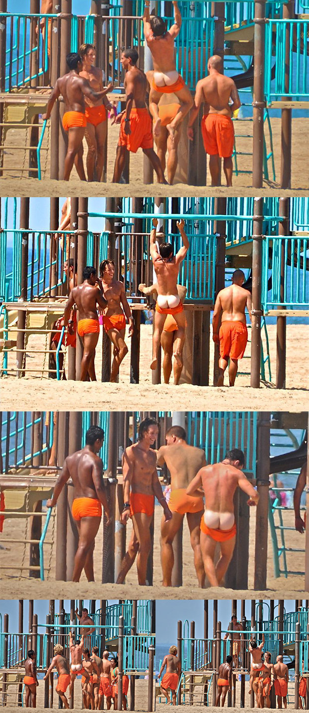 A group of straight guys at the beach wanna have fun and they dare to pull up for the girls watching them. One of this guys has a wardrobe malfunction and his ass pops out, but he doesn’t seem to be disappointed. Sure he has a nice sporty ass, why not showing it?!?!