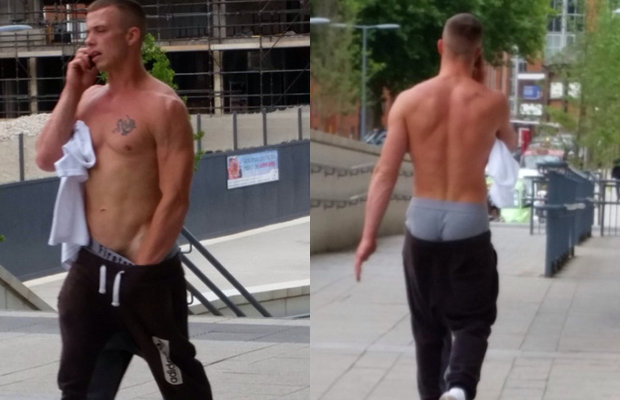 This hot straight shirtless guy has been filmed while grabbing his cock while being on the phone. At some point he shows his pube hair, then he turns back to reveal his underwear.