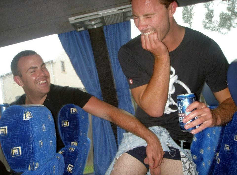 Fun on the bus: rugby players flashes his dick and his mate grabs it