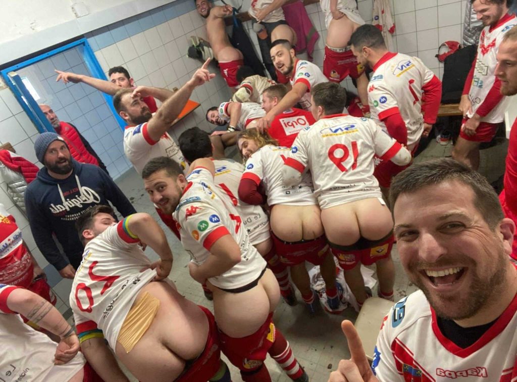 Now let’s talk about the locker room, both those of a normal gym and those of professional sports teams. It also risks being obvious, but how can you not show off naked in front of your teammates after a game? In these two photos you will see that this is now the rule! A guy is sitting in a chair while his teammates shower. It’s a very messy and dirty locker room, but he takes the opportunity to spread his legs and show off his uncut cock, and he does it with great pride. The other photo is something wonderful. I think we’ve never seen so many asses all at once. These ruggers pose and lower their shorts to show off their marble asses to the camera. Hey, there are also the ones standing on the bench, don’t miss them!