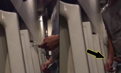 This guy is getting a boner while peeing at the urinals row and he seems to be proud of that! Instead...
