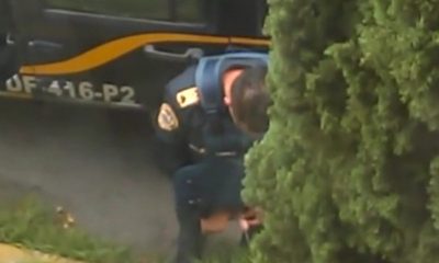 This hot stud is a Police officer and he has been caught while taking a pee in the bushes: he does...