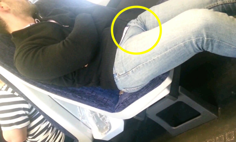 This stud has been caught while sitting on the bus, but there’s an impressive bulge in his trousers.