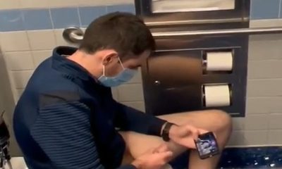 My last post about horny guys masturbating in a public restroom was from a military man caught on video by a hidden camera placed above stall. Today we enjoy another video from the same perspective. Another spycam has been placed over the stall of a public toilet and this time we can spy on a young blond boy who relaxes while sitting on the toilet bowl. I can’t understand what he’s looking at on his cell phone: it looks like he’s scrolling through a few photos, but it sure is something that turns him on and makes him touch his cock and jerk off. He can’t get a full erection, but still this candid video is absolutely hot!