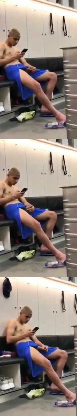 His training was perhaps too hard, but there seems to be something else hard here as well. His big cock for example! This soccer player wants to relieve the tension of an overworked game and once left alone in the locker room takes the opportunity to jerk off. He sits on the bench and pulls his cock out of the towel: watch him jerk off, this guy is really horny and doesn’t know that a camera is spying on him.