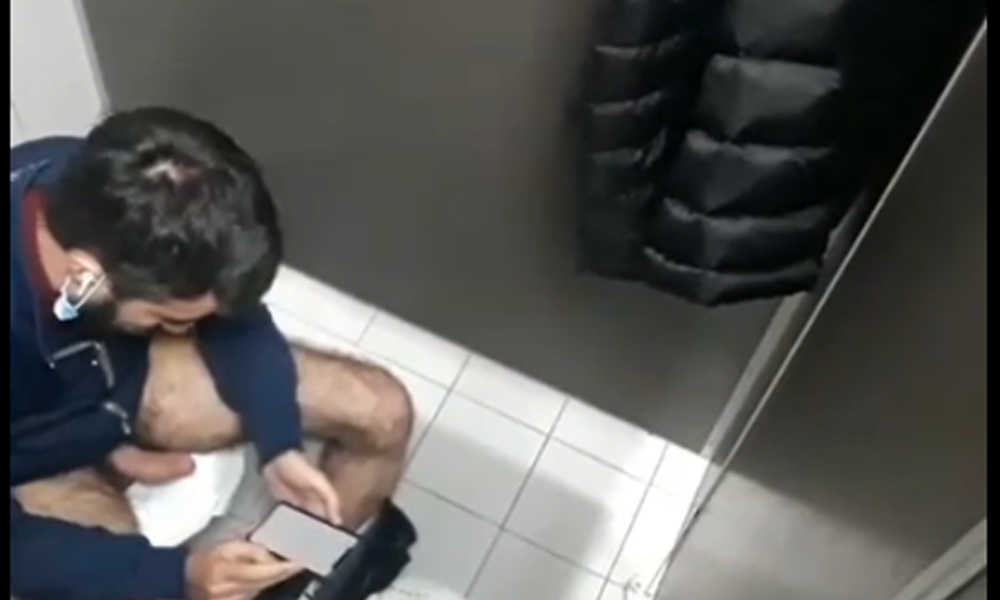This guy is watching a porn video on his cell phone and he is also wearing headphones: this means that he is very focused on it and is estranged from the noises around. He won’t notice that a spycam is watching him from above the stall! I really like this candid video because this hairy guy occasionally lets go of his grip on his cock so we can get a good look at it while it’s hard. This guy is very hairy, his cock is too: I think you will go crazy watching this spycam video! Enjoy watching this guy caught wanking in a public bathroom.