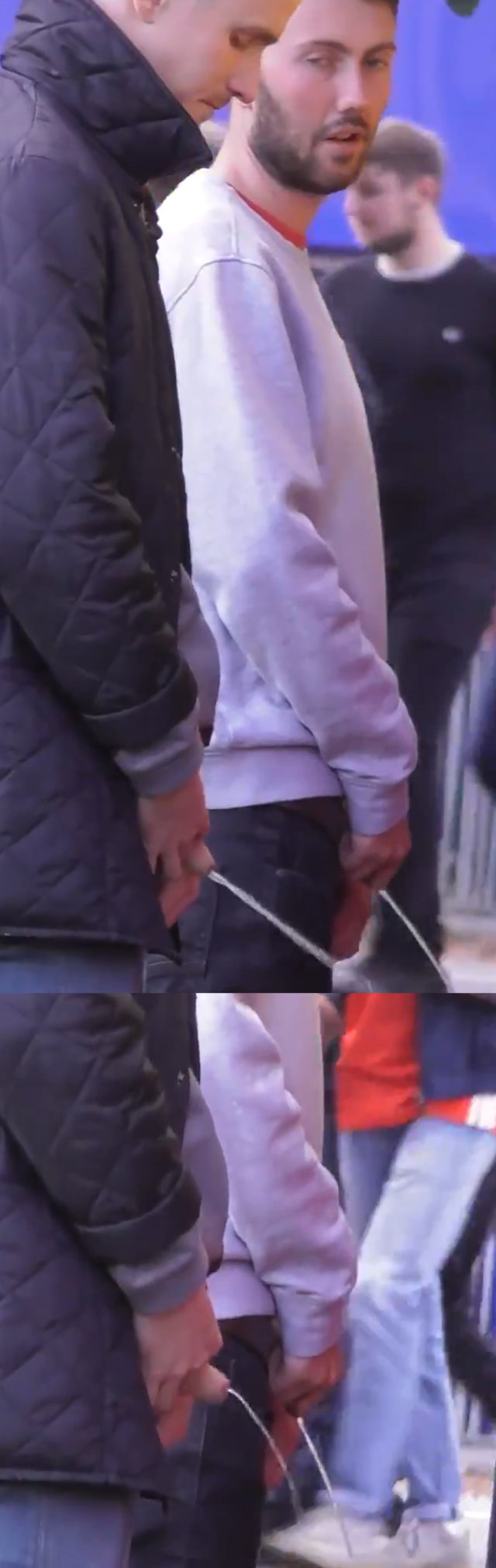 I don’t know whether it is more exciting to focus on the stares of these straight guys chatting with each other as they piss in the park or on their uncut dicks. A group of soccer fans were caught by a hidden camera pissing next to each other after a game. There is no awkwardness between them, they pull out their dicks and piss in the open air as if nothing happened.